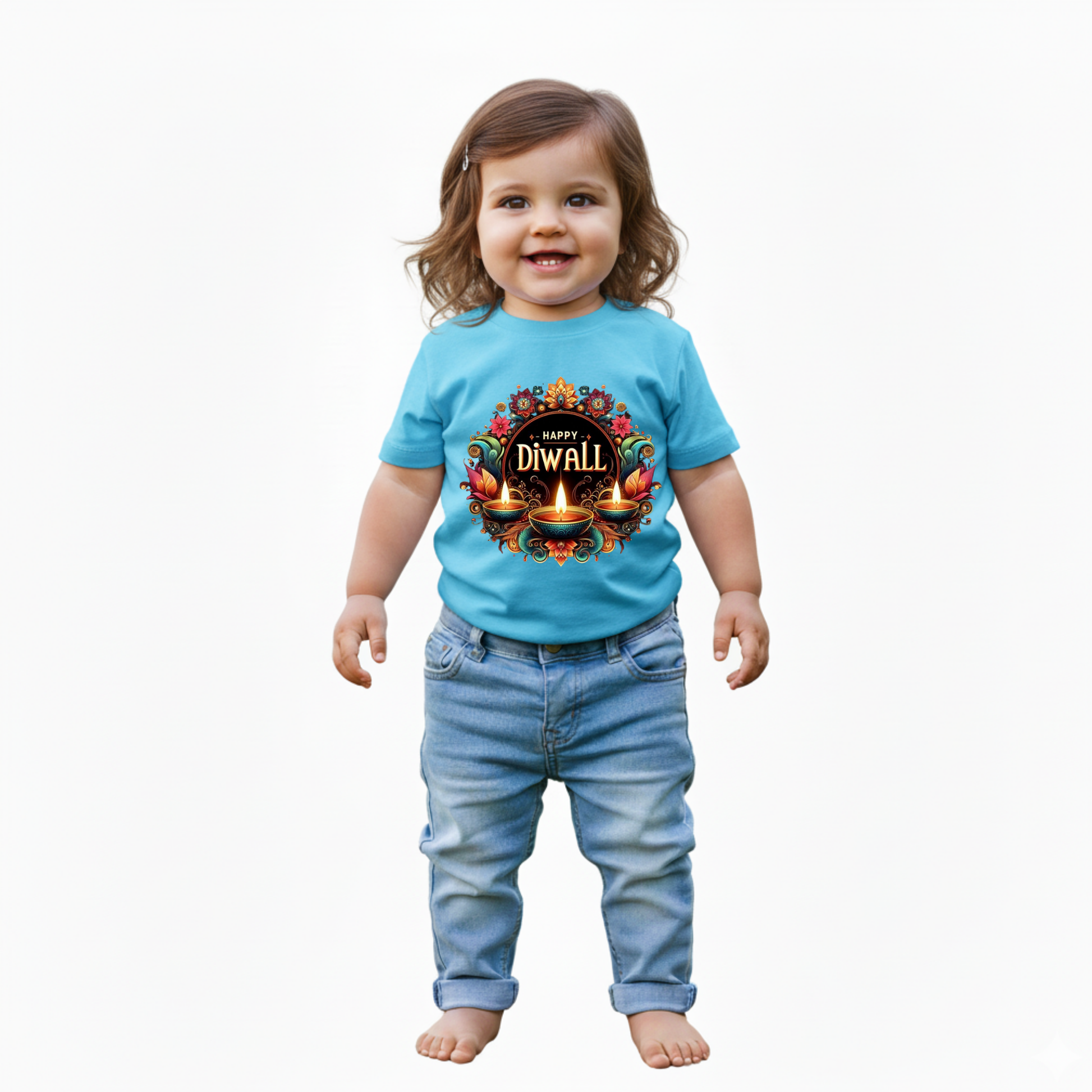Dress your little one in festive cheer with this sky blue infant T-shirt featuring a charming "Happy Diwali With Diya" print. Soft and cozy, it keeps your baby comfortable while adding a splash of joyful color perfect for celebrating the festival of lights. Easy to wear and adorable to see, it’s a playful way to share the Diwali spirit!