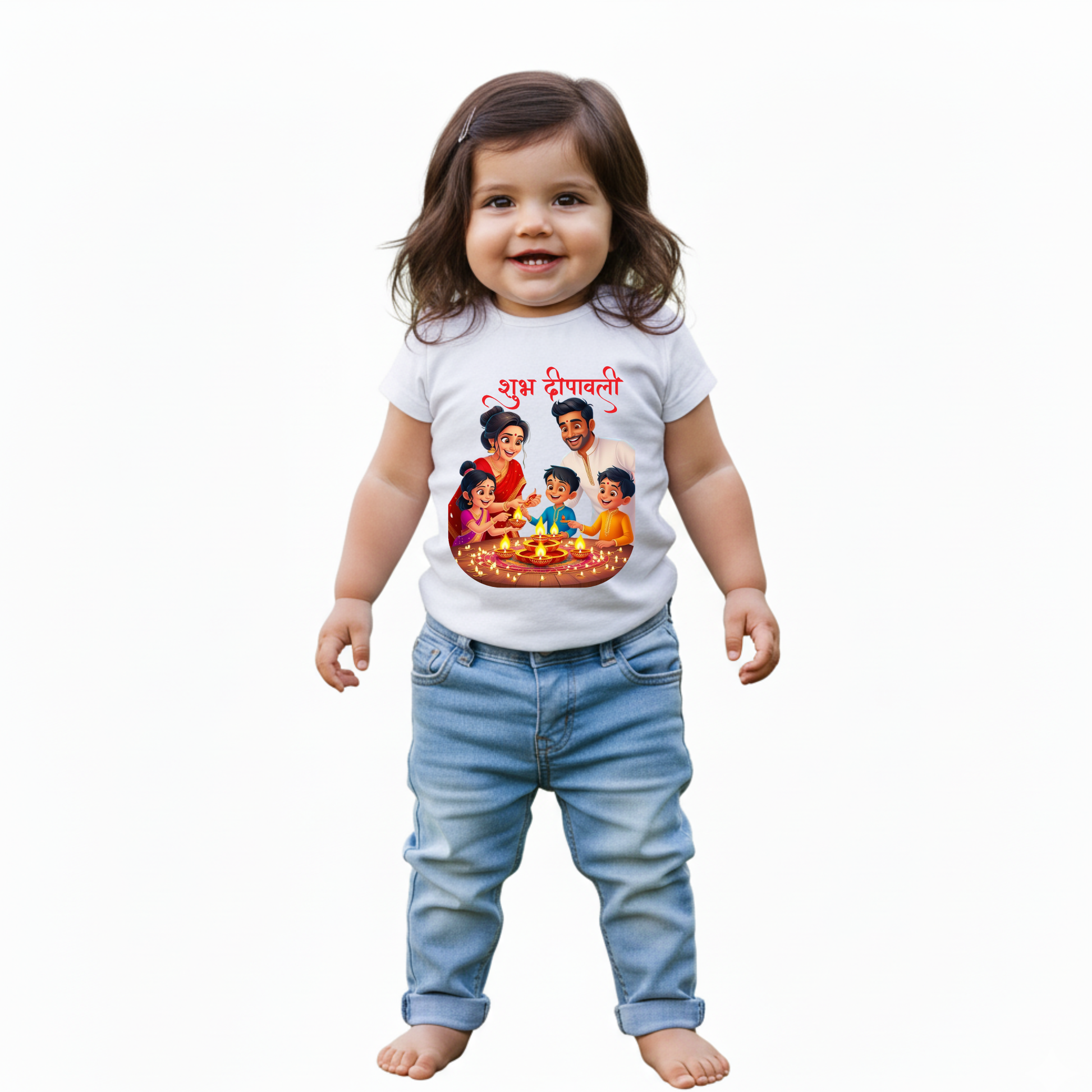 Celebrate the festival of lights with this adorable white infant T-shirt, featuring a cheerful "Subh Deepawali" print. Crafted for comfort, it keeps your little one cozy while spreading festive joy. Perfect for bright smiles and sparkling moments during Deepawali celebrations!