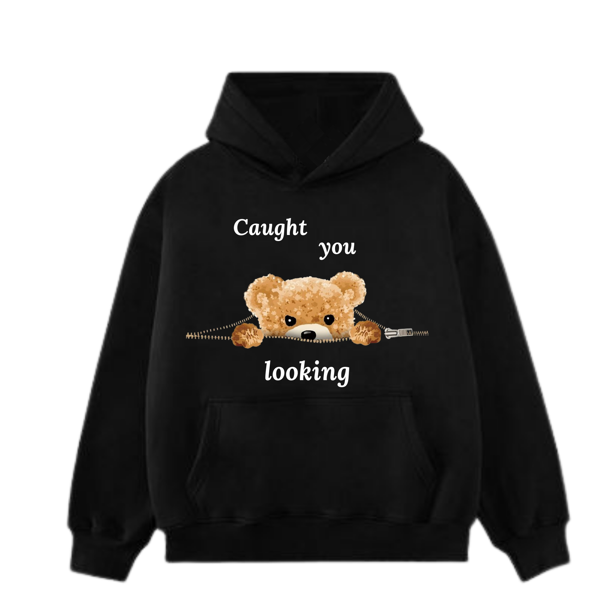This premium black hoodie features an irresistibly cute graphic design showcasing a fluffy teddy bear peeking through a zipper opening, paired with the cheeky phrase "Caught you looking" split across the top and bottom. The teddy bear illustration is beautifully detailed with soft golden-brown tones, sparkling accents, and expressive eyes that bring personality to the design. The realistic zipper graphic adds a clever 3D effect, making it look like the bear is playfully emerging from your hoodie.