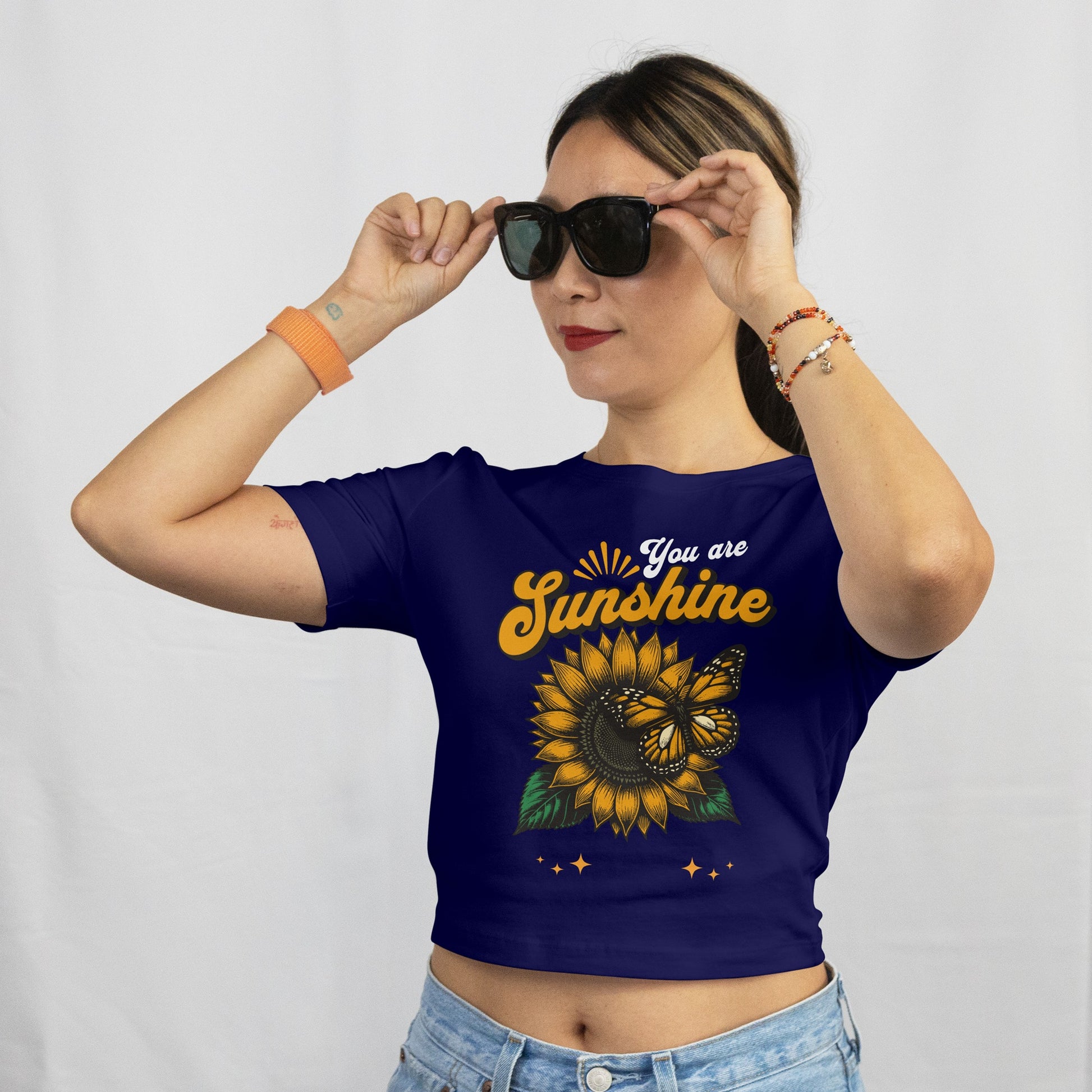 Bring a little sunshine wherever you go! This comfy, flattering navy crop top is the perfect addition to your casual wardrobe. The bold "you are sunshine - sunflower" graphic is a daily dose of positivity, making this shirt a must-have for bright days and cozy nights.