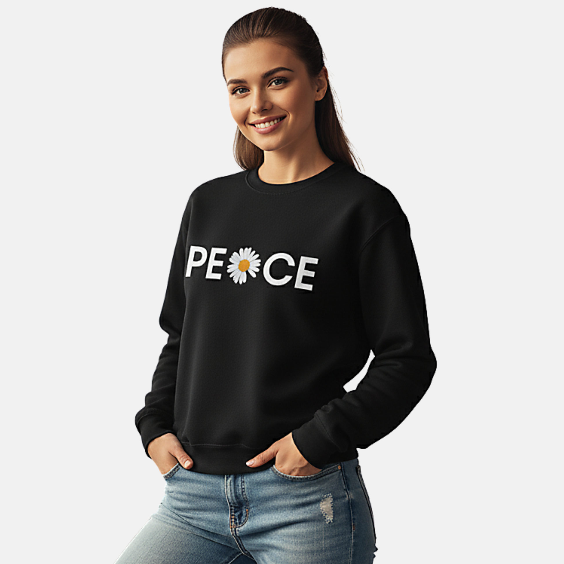 Spread good vibes with this delightfully optimistic sweatshirt. The classic black crewneck is brightened by the bold word "PEACE," where the letter 'A' is replaced by a cheerful daisy flower. This high-contrast graphic offers a clean, modern take on the iconic Flower Power aesthetic of the 60s and 70s.