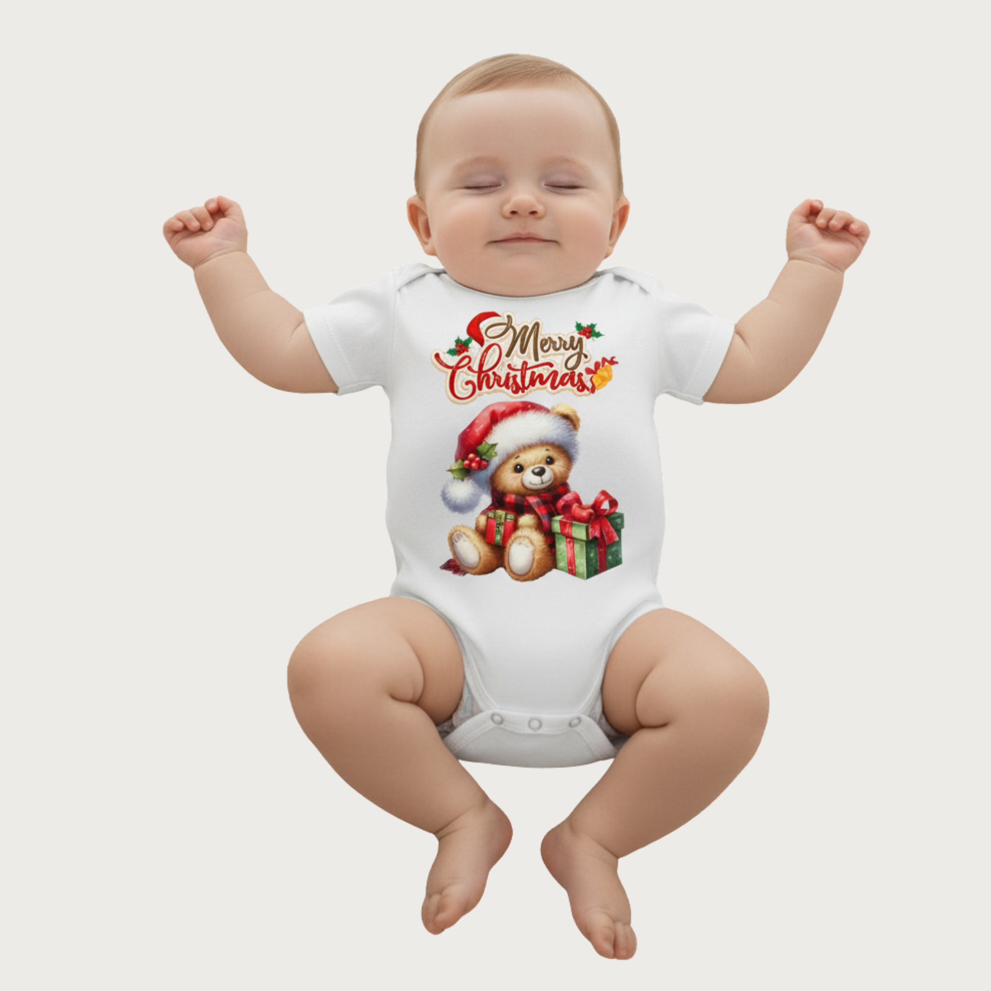 Celebrate the magic of the season with this must-have Christmas onesie! This charming bodysuit features a cuddly teddy bear in a festive Santa hat and scarf, clutching a wrapped gift, underneath a whimsical "Merry Christmas" script.