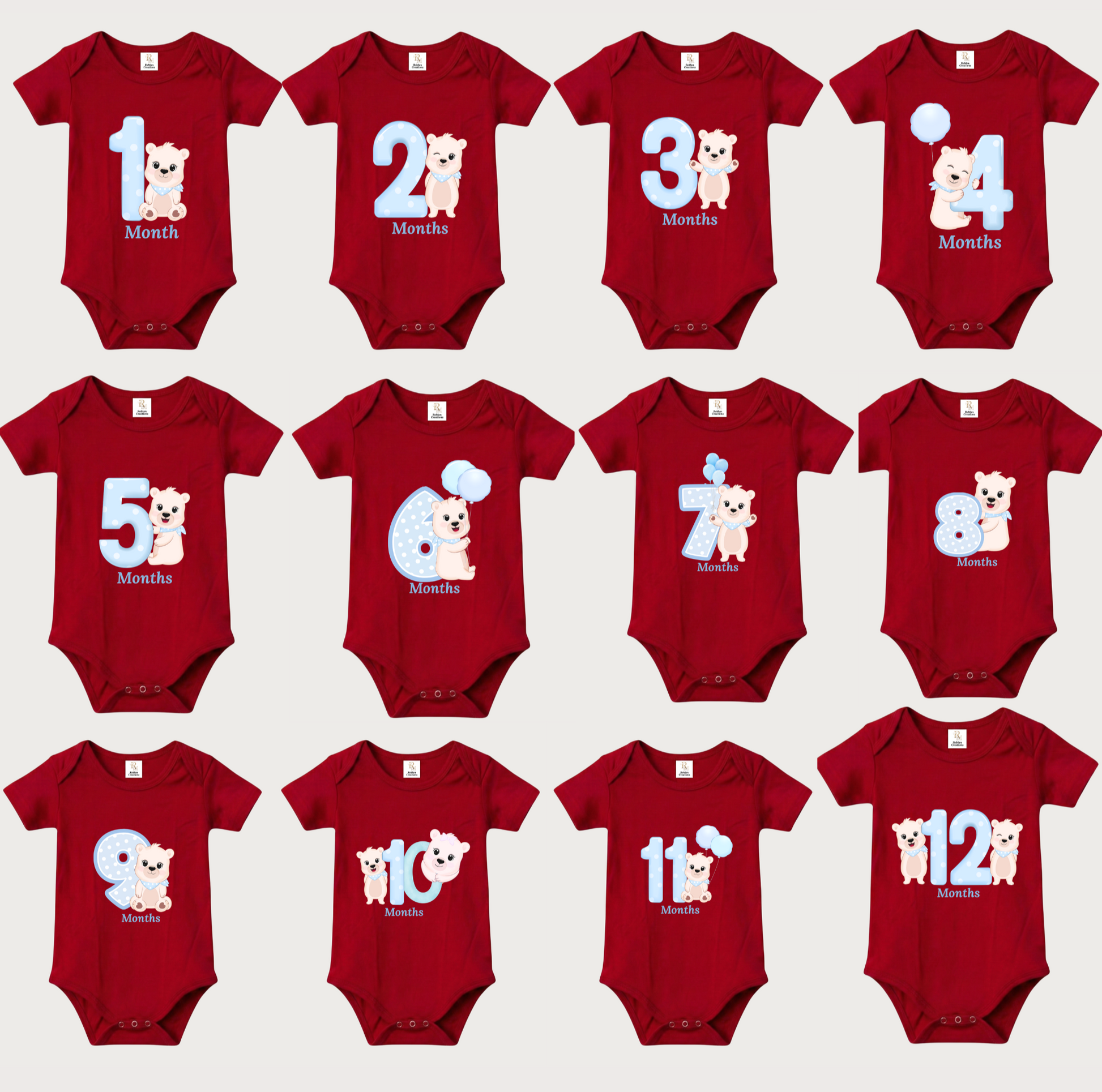 Outfit Includes: Bodysuits for 1, 2, 3, 4, 5, 6, 7, 8, 9, 10, 11 Months, and the grand 12 Months (1 Year!) finale.