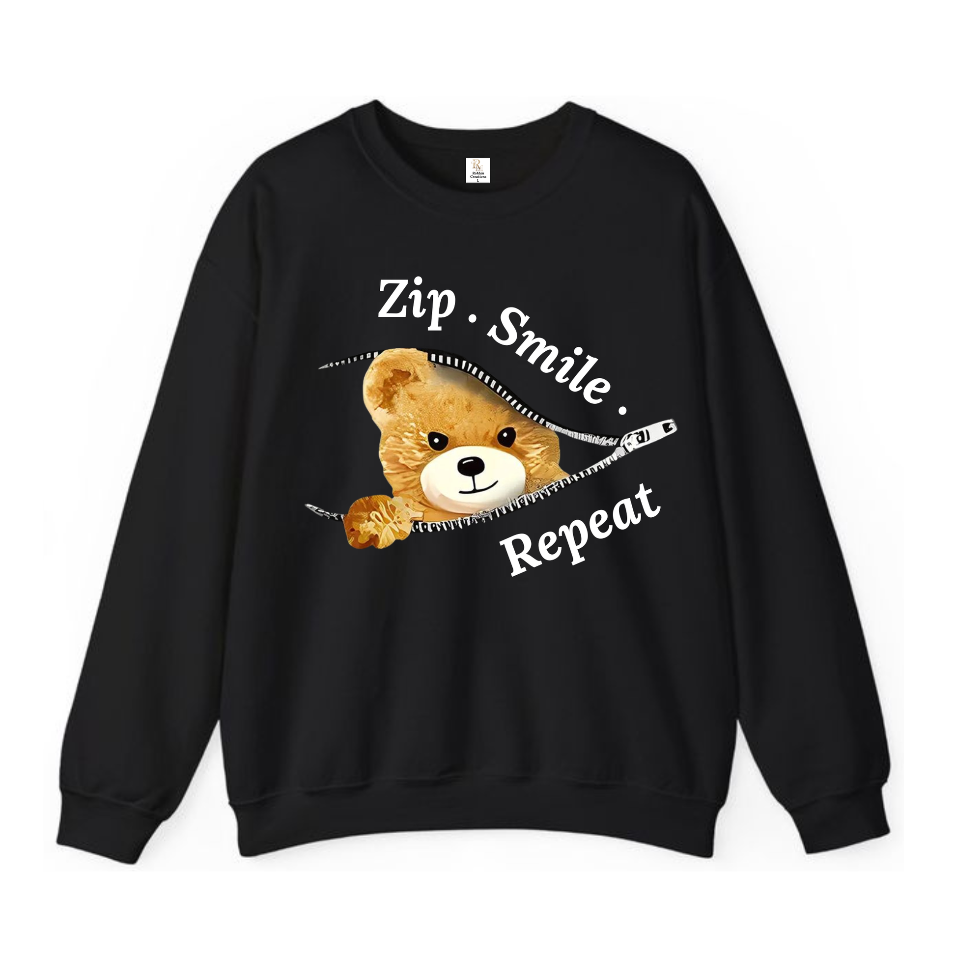 This black crewneck sweatshirt is designed for those who find joy in the little things. Featuring a cheerful teddy bear playfully peeking through a zipper graphic, paired with the uplifting message "Zip, Smile, Repeat" in white script, it's a reminder to keep life simple and stay positive.
